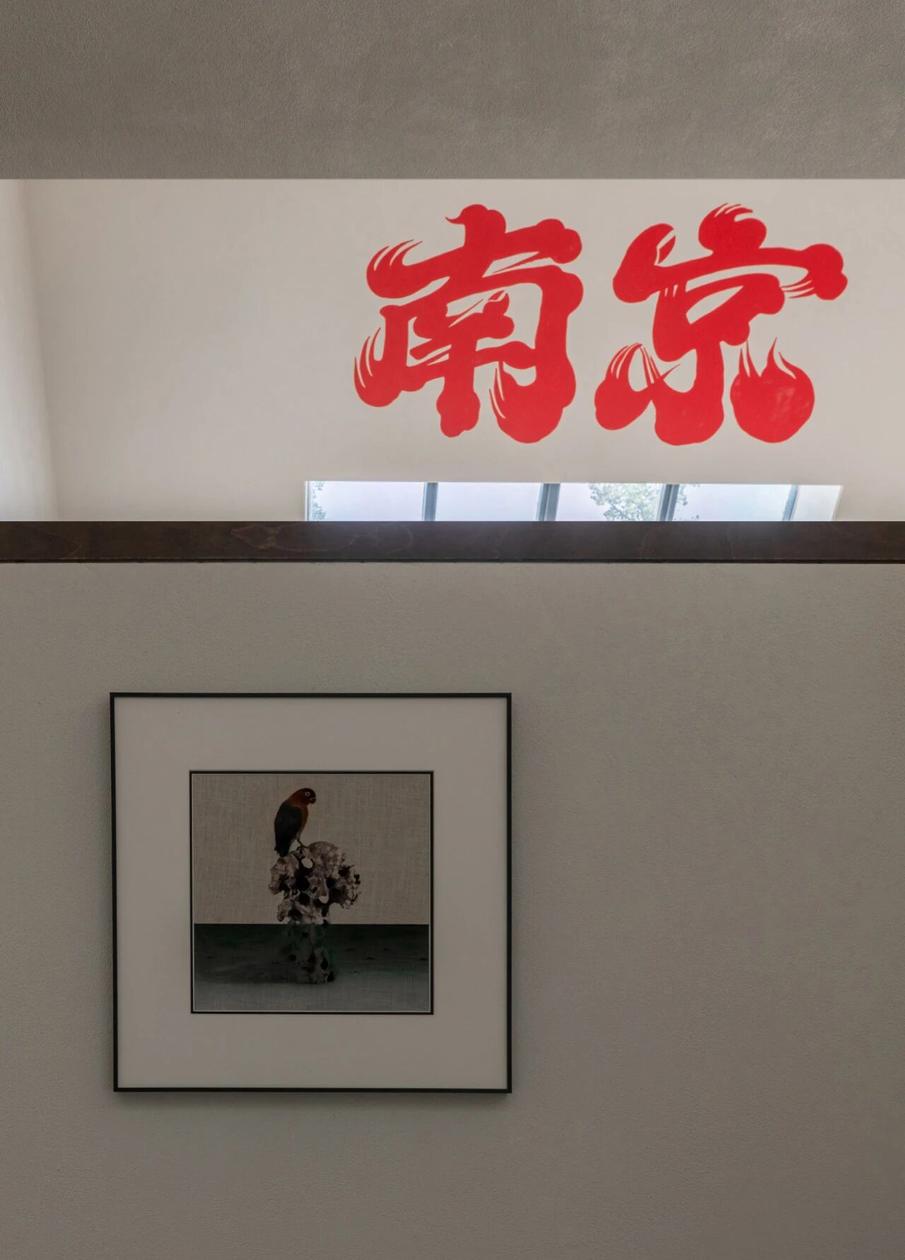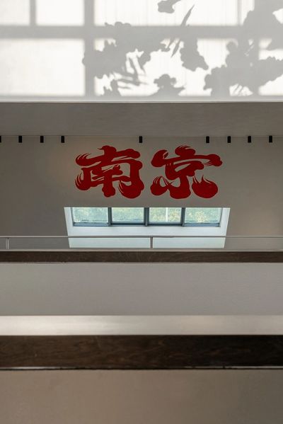 天窗下悬吊的大型艺术装置投射到立面,光影如悬铃木树冠,朱红色的“南京”两字跃然其上,饱满恣意——杨氏青的烟火和风情,皆不言自明。