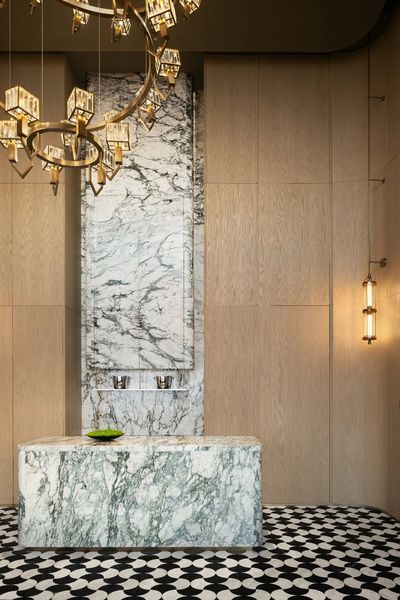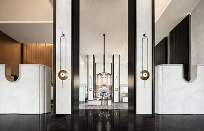 穿越居中柱體的核心軸線,賓客在感受挺拔空間氣勢的同時,被近人尺度的石質接待臺與點綴其間的靜謐水景所撫慰。