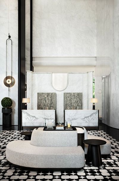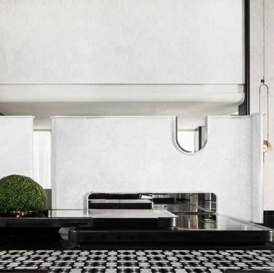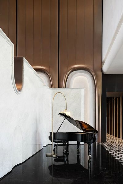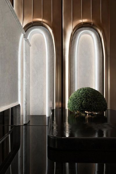 穿越門廳,一道4米高的弧形白色大理石影壁豁然眼前,構成一個極具儀式感的現代“玄關”。其高度巧妙拉近了人體尺度與11米層高空間的懸殊感,形成視覺上的緩衝與過渡。半遮半掩間,引領著視線與腳步,為即將展開的恢弘大堂奏響含蓄而莊重的序曲。