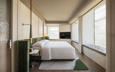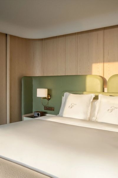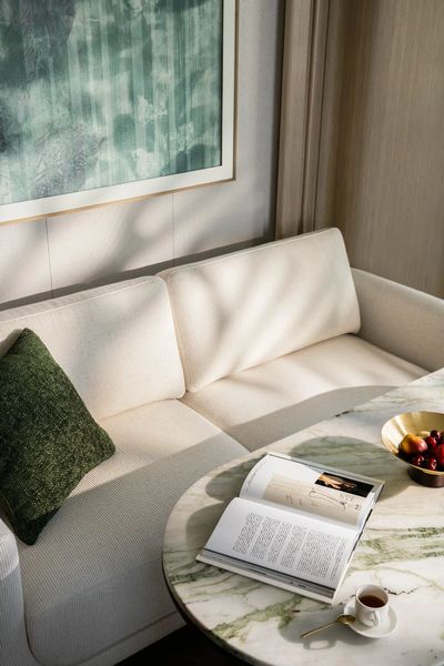 客房的設計試圖回歸家的本質——溫柔舒適,鬆弛自然。特別定制的絲絨床頭背景帶有細膩的肌理,不同觸感的柔軟織物,圍合出純粹的米白色睡夢天堂。
