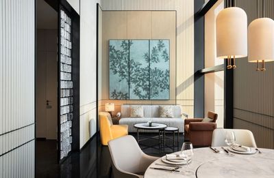 總套空間優化後的玄關設計,入戶即見壯麗城景或海景。流光溢彩的水吧臺、挑空餐廳營造非凡的用餐氛圍與體驗,個性化便利設施與多處精心佈置的私享空間,共同營造府邸般的歸屬感。