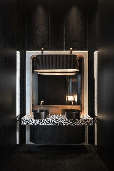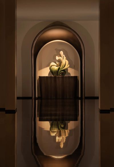 從入口的弧形接待臺到散廳的藝術裝置,青瓷盞的半盞造型懸於挑空之處,既保留了建築原有的高聳氣勢,又以低奢的曲線勾勒出儀式感。釉色之綠作為點睛之筆,綴於經典黑白基調中,典雅而不失活力。