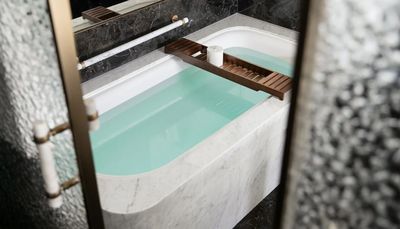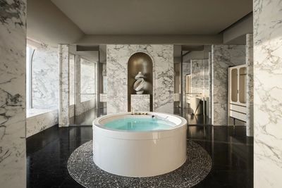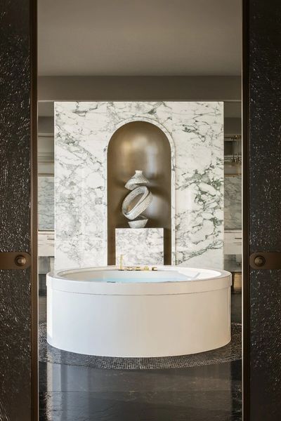 寬敞奢華的特色石材浴室是身心的避風港,獨立的大圓形浴缸邀請您沉浸放鬆,而偌大的步入式衣帽間則提供了私密而高雅的收納空間。