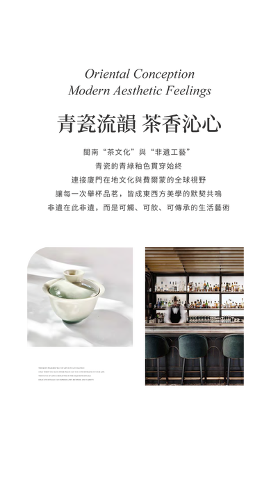 西式吧臺與中式茶席並置,法蘭絨餐椅搭配青瓷釉色靠墊。服務流程融入閩南“功夫茶”禮儀,使品牌奢享精神與東方待客之道相契。