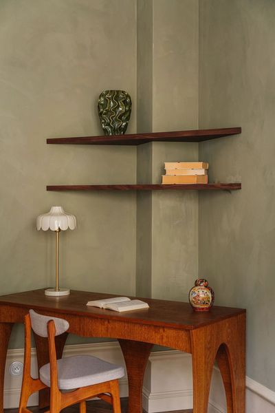 卧室设有充满风景的艺术墙,橄榄绿墙壁与原木家具的搭配,增添了温馨奢华的氛围。床铺采用白色和淡蓝色的床上用品,增添清新感,复古的床头柜和经典的立灯彰显精致的细节。
