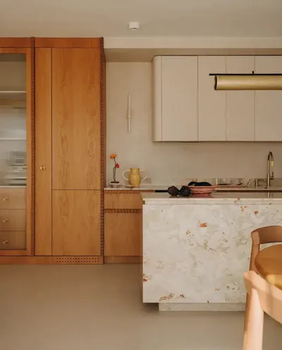 在厨房里,台面决定了空间的整体氛围。薄荷色的下柜温和地平衡了黑色大理石的强度,让空间显得清爽宽敞。具有复古感觉的马赛克瓷砖图案为地板增添了活力。绿色、红色和米色的组合和谐地营造出充满活力而不单调的厨房氛围。