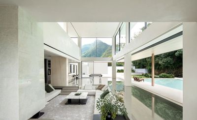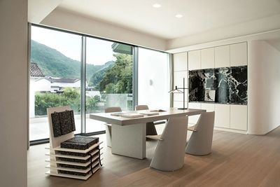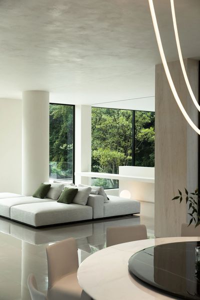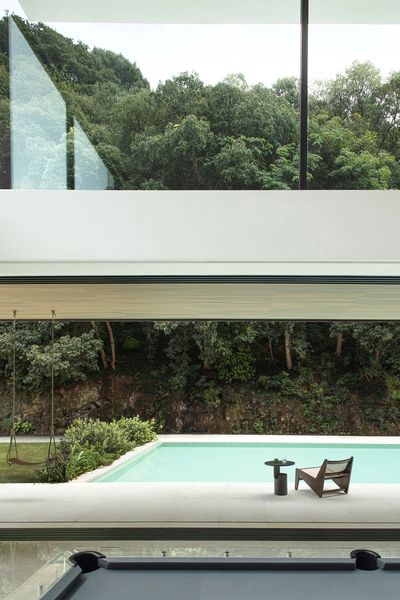 这栋地上两层地下一层的建筑依山而建。山势起伏,林木近在咫尺,建筑与自然之间,有一种“格格不入”感。于是,设计师选择了“移山入室”。地下一层临山的立面被尽数打开,换作大幅可动的长窗;同一区域,上下楼板也一并拆除,纵向挑空近八米。山景由此破窗而入,不再是遥望的客体,而是室内的主体。