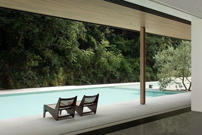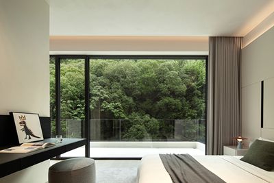 设计师仿佛创造了一个巨大的玻璃画框,将原本有些距离感的自然山林,一下子就“拉进”了室内,古时的“坐山观景”,也有了当代的“具象”。
