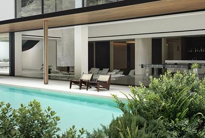 例如从一楼玄关开始,经过中西厨和餐厅区域,空间通道中的光线会越来越明亮,豁然开朗之处,便是映入眼帘的整座山,和山下的湖泊——泳池,当目光的焦点落在泳池边下沉式沙发区那一颗姿态万千的树木之上时,更让人忍不住继续拾步向前。