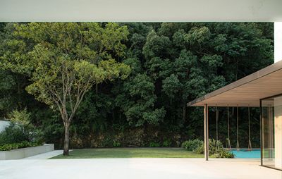 在私宅项目中少见的大面积纵向泳池,被放置于家和山之间的园林区域,为空间注入了几分度假般的松弛氛围。而得益于会稽山自然林木充满东方意蕴的景观加持,整个设计毫无浮夸或突兀之感。与此同时,山和“湖”的呼应,也在私宅的边界内,创造了一种更深维度上的自然共生。