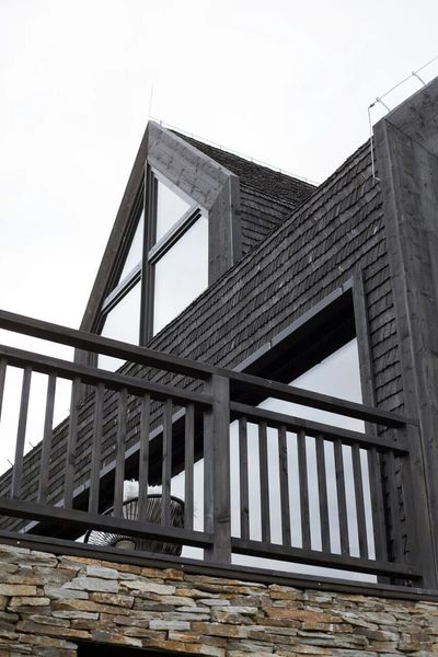 The project’s main material is wood, reflecting both environmental sensitivity and a deep connection to local building culture. The roof and facade are clad in hand-laid aspen wood shingles, while the entrance door and much of the interior are constructed from aged timber sourced locally and chosen for its texture and patina. A characteristic stone foundation, typical of regional mountain buildings, grounds the structure and evokes the language of historic shepherd huts.