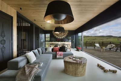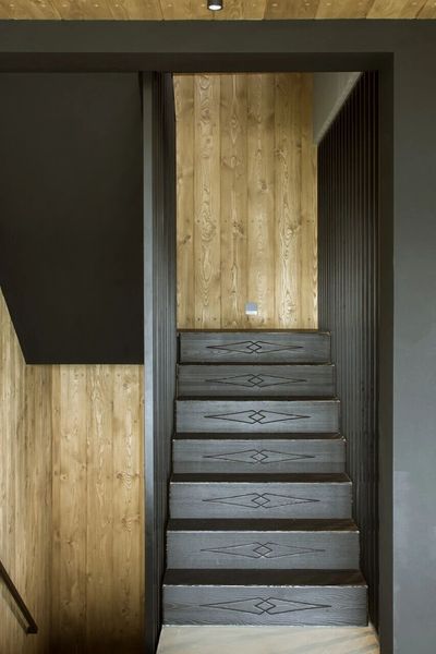 Inside, the design is a restrained yet warm composition of greys, blacks, and natural wood tones. Custom furniture designed by the architects features simplified folk patterns, laser-cut motifs, and decorative carvings echoing local traditions. These elements appear repeatedly -on doors, furniture, and staircases - creating visual continuity and a sense of cultural layering.