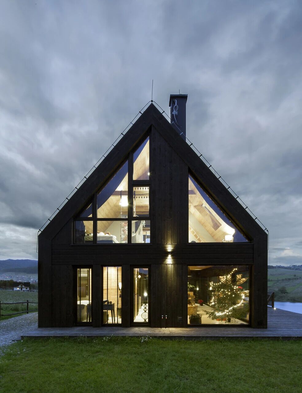 This intimate house blends the tradition of pastoral mountain architecture with contemporary form and advanced construction techniques. Its compact yet expressive form responds to the sloping terrain, which opens the building towards the lake with wide glass surfaces, while the entrance façade remains modest and windowless - intentionally creating a contrast of openness and privacy. This duality not only respects the rhythm of the land but also accentuates the natural beauty that envelops the building.