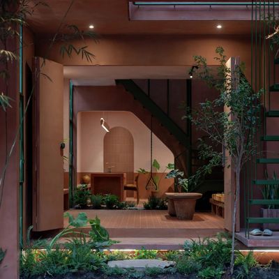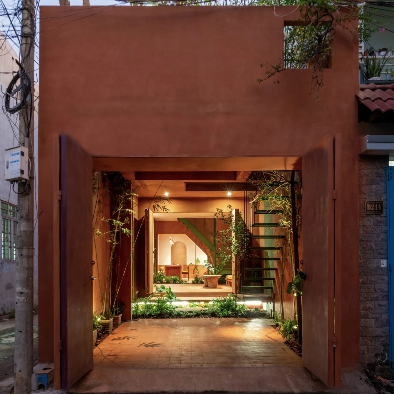 材料与建筑细节:为了营造出陶艺般的质感,我们选择了赤陶砖、再生木材、原钢以及混合了黏土的水泥等材料。所有这些材料都保持了其自然、未加工的状态,呈现出温暖而质朴的色调。 最初,我们考虑使用纯黏土来粉刷墙壁,但越南南部恶劣的气候条件——强烈的阳光和长时间的降雨——使得黏土容易开裂并被雨水浸湿。因此,我们尝试在黏土中加入水泥、添加剂和颜料,以提高其耐久性,然后涂上一层透明的防水涂层——这类似于工匠在陶瓷制品最后阶段所进行的上釉工艺。 这一过程促使我们开发出一种新的混合材料:它既保留了黏土的温暖触感,又能抵御当地的气候条件。