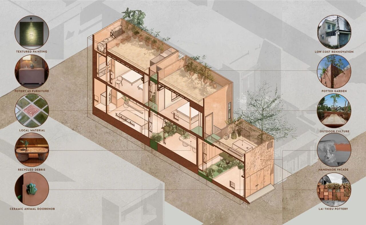 挑战与机遇:最大的挑战在于预算有限以及必须利用现有的建筑结构。这是一栋低成本翻新的房屋,因此我们无法对结构进行大幅度的改动。相反,我们采取了适应现有条件的设计方法。 然而,这些挑战也带来了再生的机会:我们使用了再生材料,与房主合作手工制作家具,将旧有的建筑转化为全新的空间。这种做法的意义远不止于节省成本。陶艺之家拥有自己独特的特色。 我们非常喜欢这个项目,因为它不仅充满了灵感,与当地的文化传统紧密相连,还融入了房主的个人风格,同时对越南的建筑环境产生了可持续、友好且具有适应性的影响。