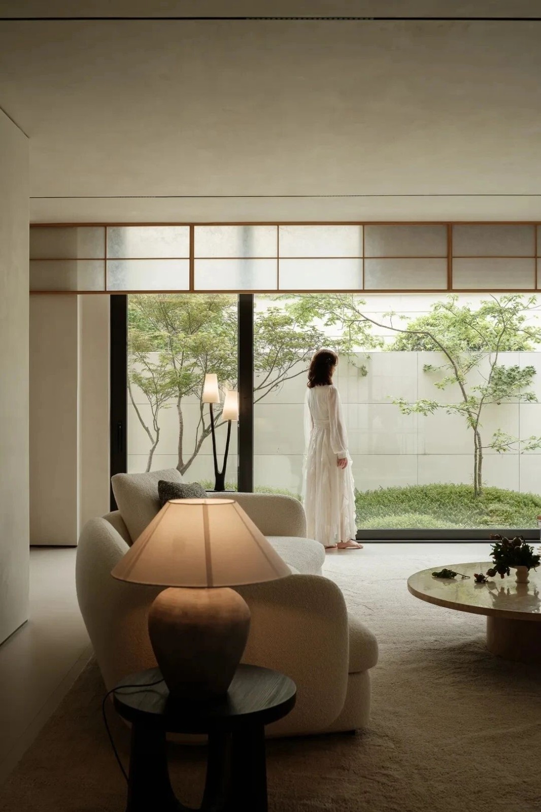 略低的天花、较密的梁节奏与可倚靠的厚窗洞进一步增强了房间的包裹感。