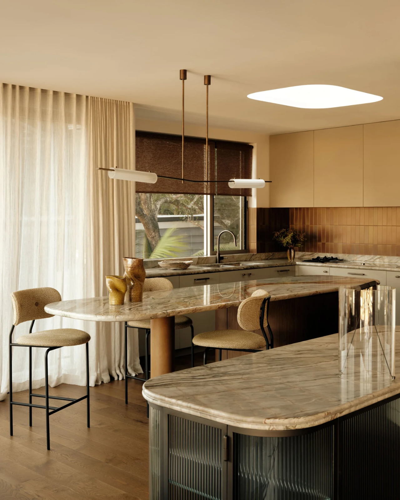 这种真实的、宽敞的、实用的欲望所产生的效果,都变成了一个整体,在其盛行的魅力中,这是一种略带乡土色彩的美学。天然石材柜台和木地板发挥粗糙的亚麻织物和未经修剪的混凝土楼梯,以创造一种当地尊重和自然磨损的复杂感。虽然家里所有的便利设施都是尖端的,但所有选择的电器都有一种略带老式气息的感觉,以创造凝聚力,一直到老式厕所,有着高高的水箱和拉链。
