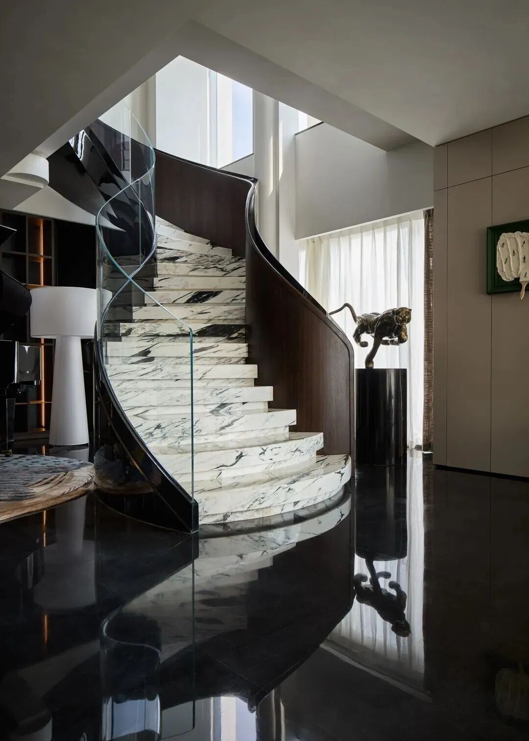 原有建筑的工业美学保留了一个定制不锈钢厨房,开放式金属楼梯和暴露钢柱,补充了新的金属框架中庭玻璃,以及浇筑混凝土树脂地板。