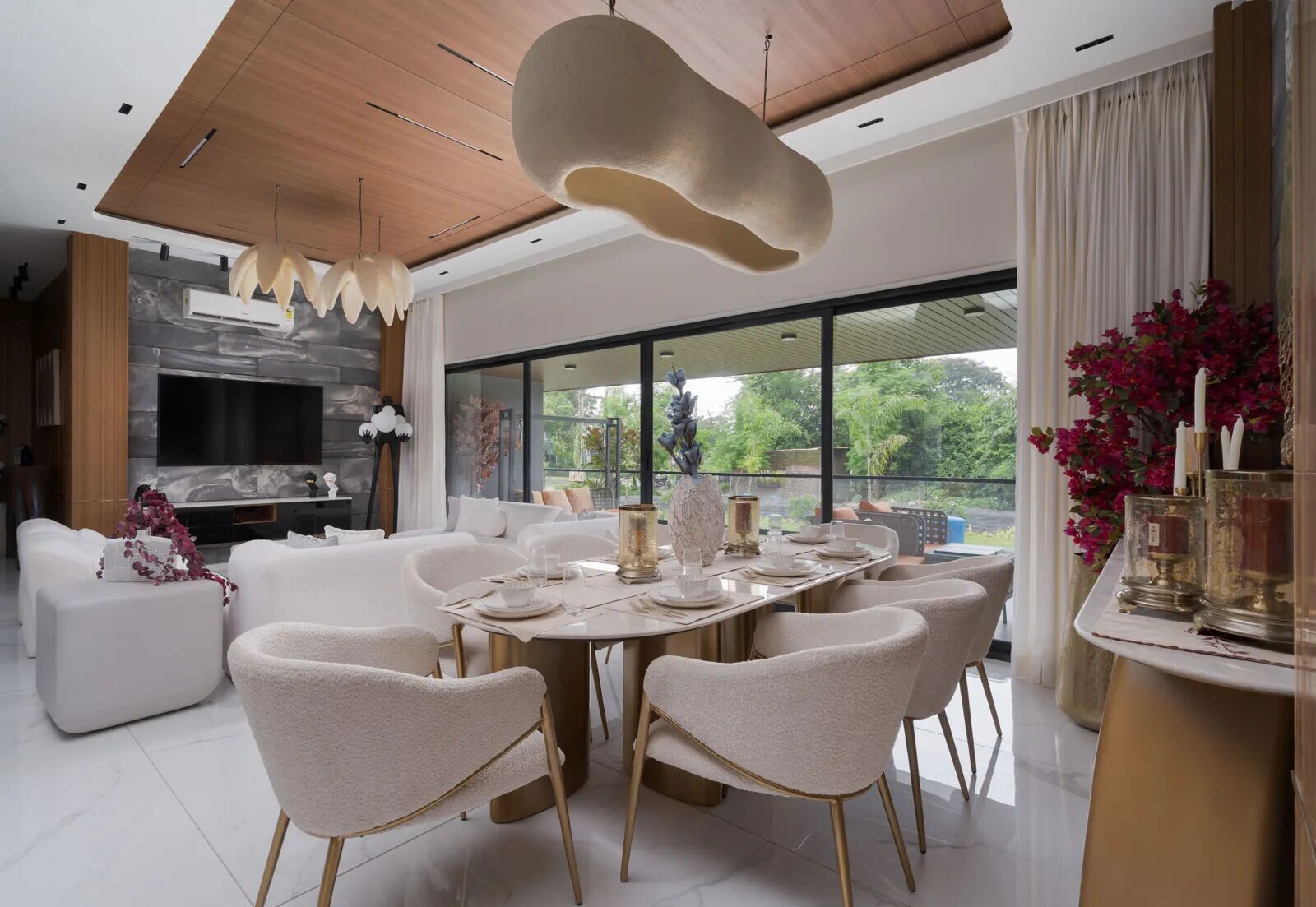 一片面积约4000平米的平屋顶 遮阳格栅覆盖了整个建筑场地。屋顶遮阳格栅设计意象来自于周边农田景观的线性肌理,并结合方格网结构与平直楼板产生“柔化”的效果。遮阳格栅会产生由建筑中心向两边产生由密到疏的渐变排列,每一条格栅本身也存在着弧形的宽度渐变,同时铝制格栅表面穿孔以弱化实体感,由此将钢结构屋面与遮阳系统结合为一个整体的大屋顶。半透明感的屋顶宛如阳光下一片巨大的灯罩,其下的建筑和庭院自然演变为光影的森林。空间跟随着一天之中阳光的变化,光影的韵律交织叠合,与人的活动一起共同演绎生动的自然场景。