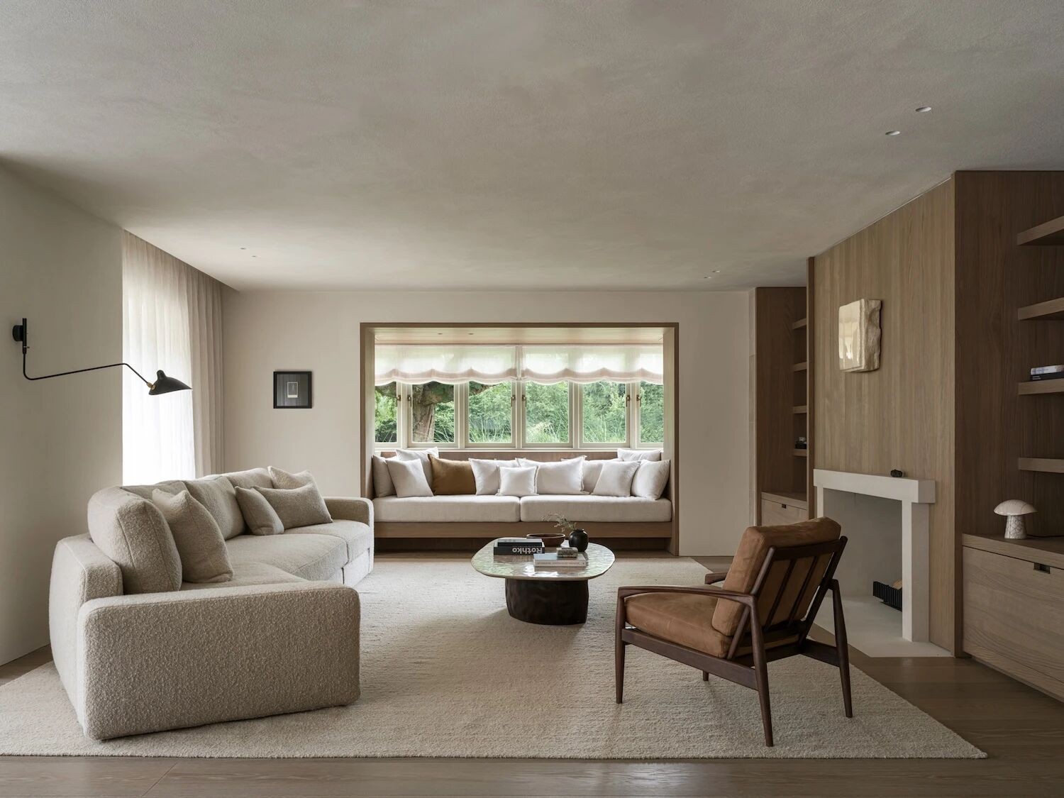 在所有墙壁上都使用了相同的灰泥,这使房间看起来非常舒适和放松。
