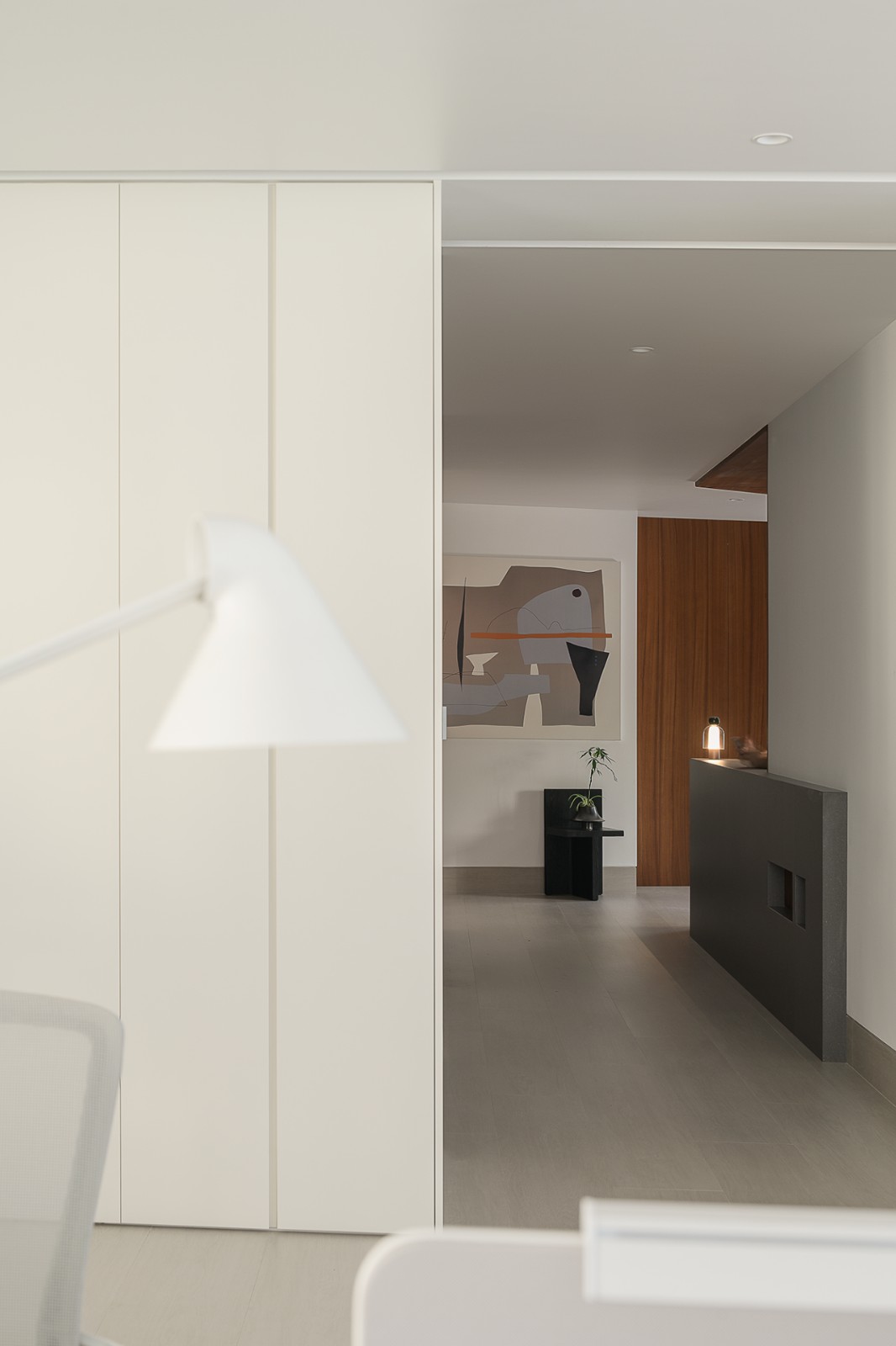 厨房与餐厅相连,共享中性色调的背景板,墙面的水彩挂画与之形成鲜明对比,画作内部冷暖色调激情碰撞,从而唤醒整个空间。白橡木橱柜与一套高级的Miele电器密不可分,为烹饪时光注入科技感与生活感。