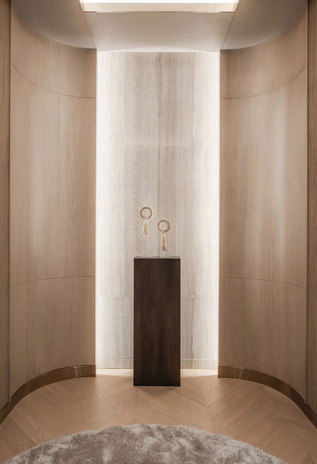 石,是时间的刻录者,红山设计在曼妙的旋转楼梯下方安置了一个特别的石块。金属与石材的拼接运用,形成光影变幻的流动效果,将自然搬入空间,并将时间定格,静静记录这里的风云变幻
