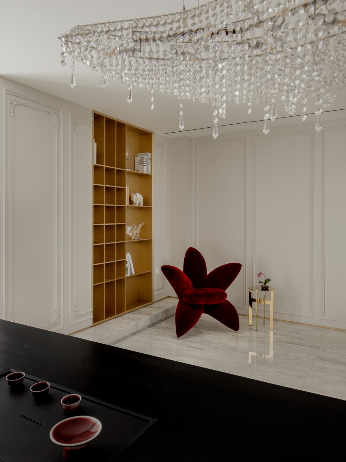 园林之趣一则是廊庑庭院的九曲连环,一则是翠植怪石的奇崛清姿。设计师放弃了西方设计偏爱长枝阔叶的审美倾向,在走廊折转处布置多处山石虬枝的古典园林造景,坚韧遒劲的姿态与室内一贯的含蓄风格形成鲜明对比,为海派亦中亦洋的风格点染出东方艺术之魂。