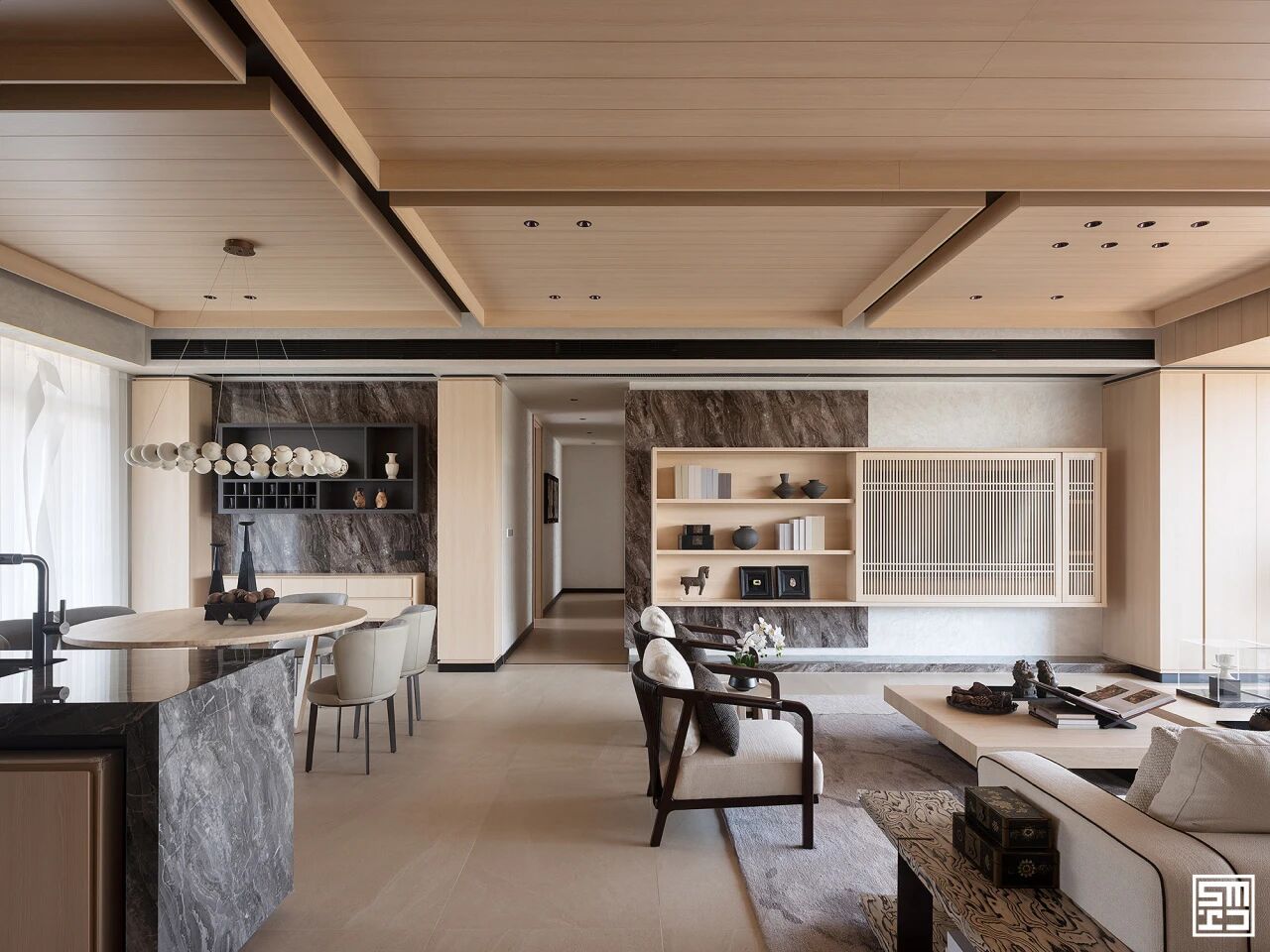 ▲经过修复,人字形拼装的木质地板散发着古典且温暖的气息,搭配的现代家具造型简约质感舒适,并且设计师通过形状上的变化,利用几何元素,带来新颖与时髦感。