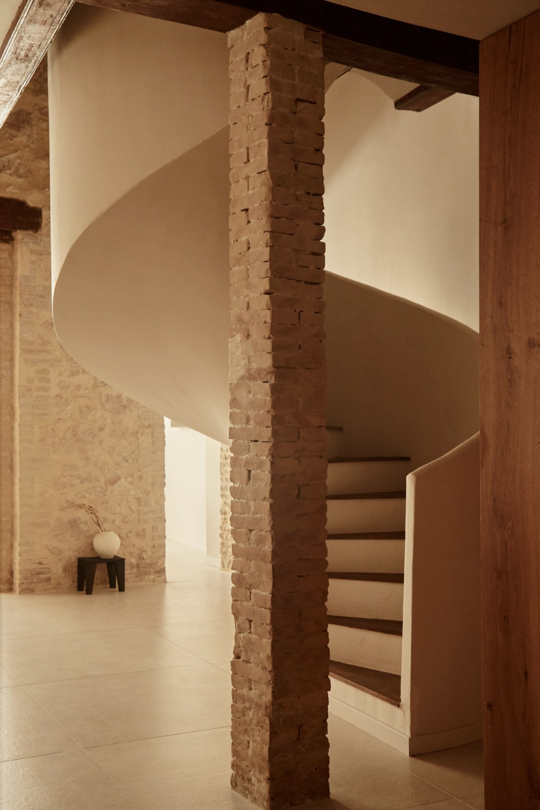 原有的建筑是个错层,Sylvia拆除了楼梯单向的扶手,变成了链接客餐厅与卧室区域的一个弧形踏步界面,消除了空间上的边界感,踏步的踏面加宽也增加了老人小孩的安全性考虑,变成了空间中一个有趣的设计。