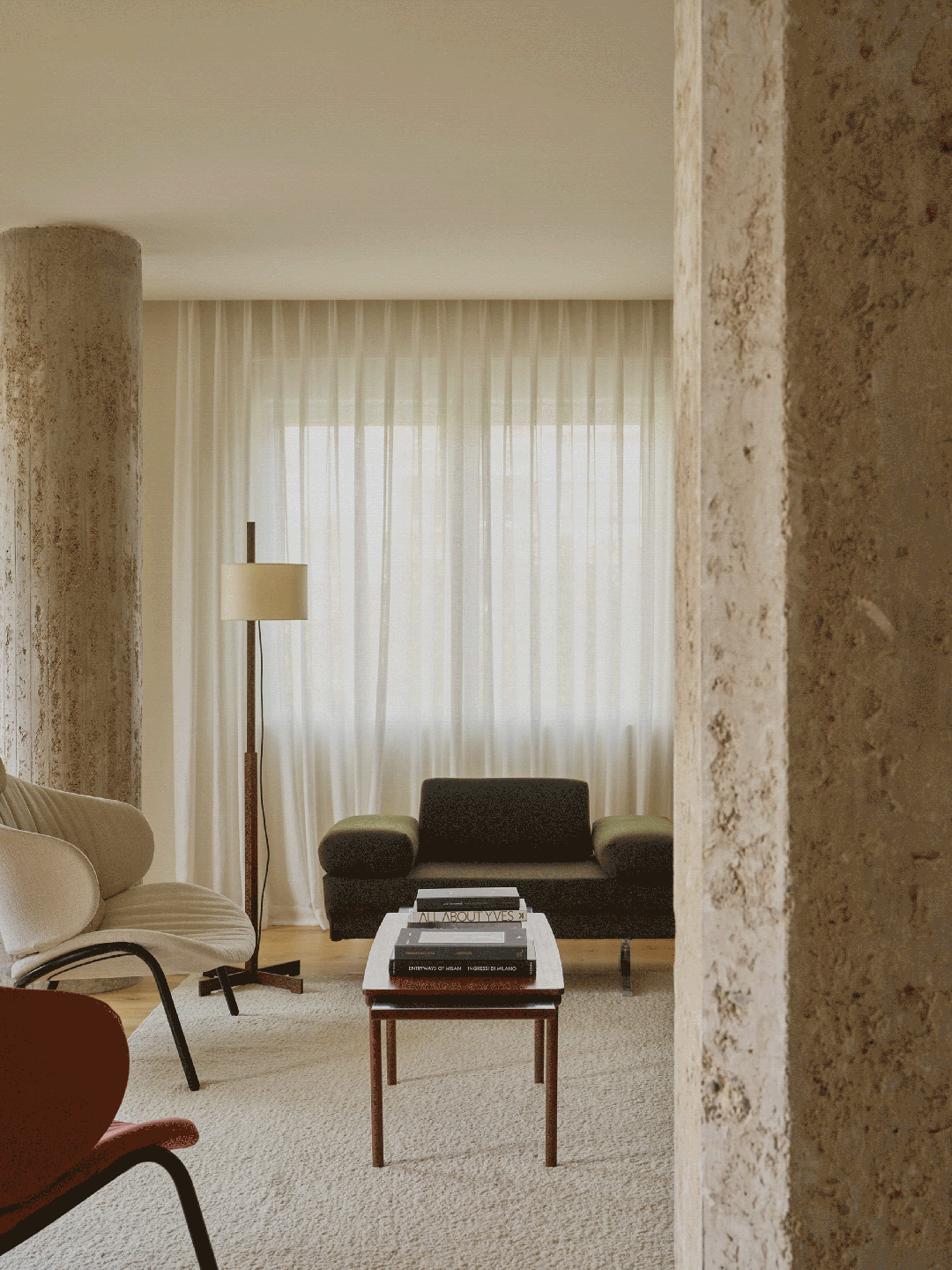 The walls of the apartment are in a neutral beige color that complements the parquet floors. The childrens playroom is slightly dark, like a self-contained box. When it comes to furniture, Fossey prefers authentic and natural materials such as stone, travertine and oak.