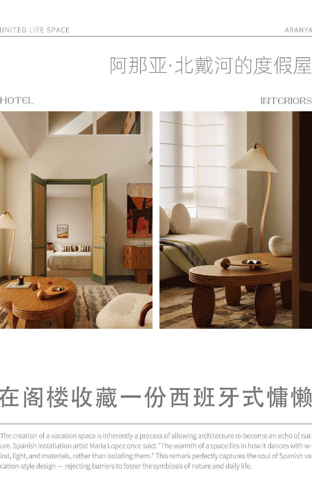 风留驻于光影之间,时间被轻轻放缓。双层露台不设方向,只提供一种被托住的自由。空气与视线构成暂停语句,边界松动,情绪缓释。建筑在此松开了结构的手,将一切还给流动的空气。旋转楼梯以曲线轻悬,如风迹游走于静止的立面之上,弧度削弱重力,线条绕过秩序。上下行间,非路径,而是过渡;引导着身体进入一种新的节奏——沉静、非线性、无需抵达。