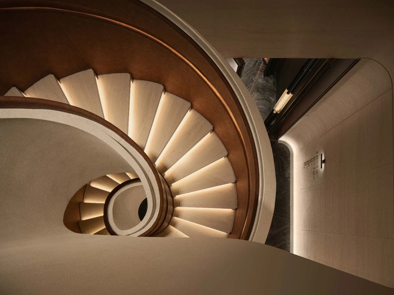 旋梯以建筑之姿起舞,流线形态若云绸绕梁。阶畔暖光如星子垂落,为每一步镀上金晖。祥云纹样暗藏梯阶,让“如意高升”的祝福在俯仰间流转。