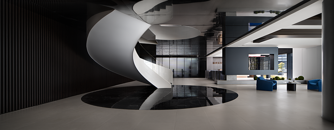 整个楼栋通过旋转楼梯贯穿,弧线的形体置入空间中,丰富空间的层次的同时引导动线导向。