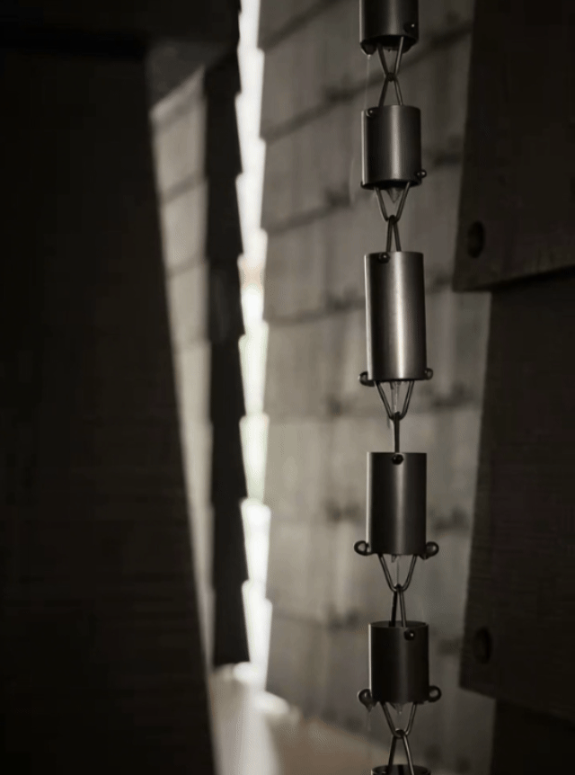 深色空间体量如喀斯特山体般沉稳嵌入,建筑语言则直接对话本地地貌与文化:建筑屋檐下的滴水链,借鉴苗寨传统民居的排水智慧,水流滴落的声响,复刻了黔地山间雨打青瓦的韵律。