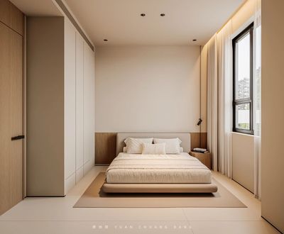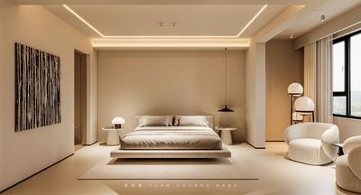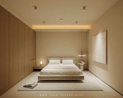 浅棕肌理与柔润光晕交织的一隅,简约床具、艺术挂画、精致灯具错落出雅致,利落柜体藏满收纳巧思。质感在空间里流转,方寸间酿成一处雅致私享的休憩小筑。