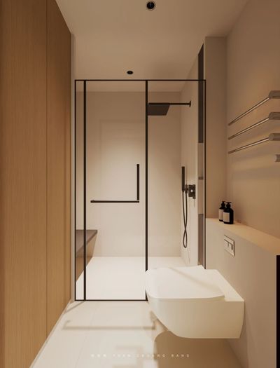 黑框玻璃与暖调木色碰撞的次卫,是简约利落的质感秘境。极简五金与利落线条交织,每一处设计都让洗漱时光在精致里,成为一场利落的美学体验。