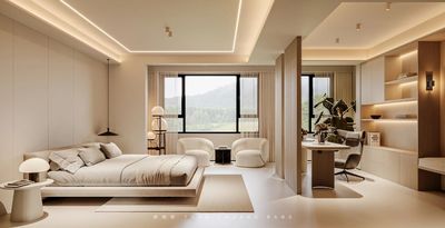 开阔空间里,床具柔糯,大幅窗景引入远山绿意,让自然的呼吸与室内的静谧丝丝入扣。书房区域的精巧布局,更让工作与休憩在此从容切换,每一处细节都在诉说,这是一场关于舒适与格调的沉浸式体验,让梦境在艺术与自然的交响中缓缓铺展。