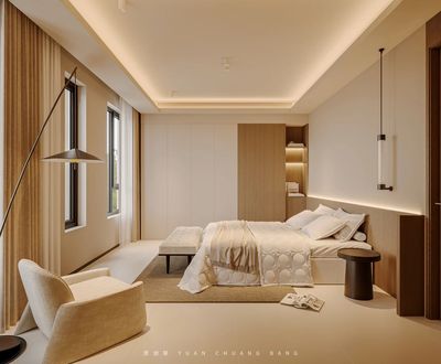 Warm wood tones and soft light outline the guest bedroom—a triple realm of elegance and relaxation. The window view draws in light; the beds, either plush or refined, are accompanied by artistic lighting and refined decor. The gentleness within clean lines, the subtle luxury in detailed craftsmanship, and the artistry of shifting light and shadow each brew their own private, healing verse within the aesthetics of rest.