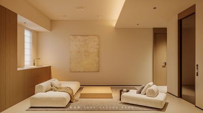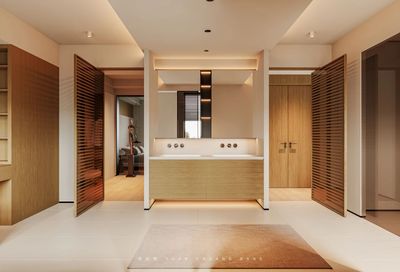 In this warm-toned space, wooden grilles define layers without compromising elegance. Dual vanities bloom with a sense of refined ritual under the play of light and shadow. The clever interplay of mirrors and lighting gradually layers the spaces texture, while the bathing nook adds a further note of relaxation.
