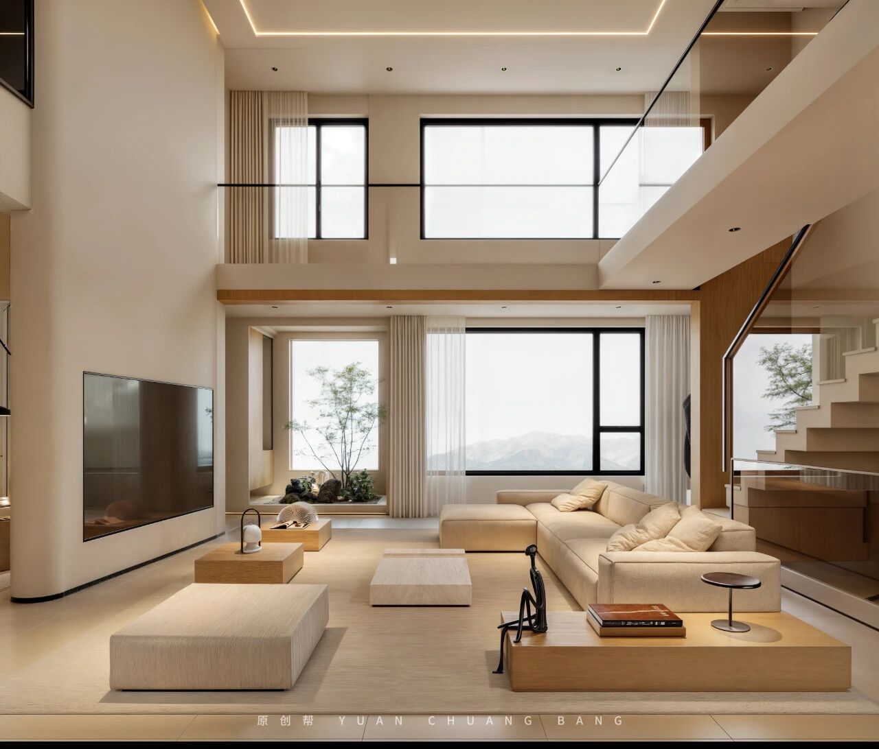 A clean foundation woven from beige and wood. A floating staircase stands as an art installation, while a vast window frames a view of lush greenery. Negative space and furnishings complement each other; the space exudes luxury within minimalism and showcases character through transparency—a poetic exemplar of modern home design.