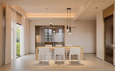 在暖光的轻拥下,餐厅如一首简约的抒情诗。原木餐桌质朴如自然的馈赠,白色餐椅似云朵落于凡间,与线条吊灯共舞,勾勒出极简主义的轮廓。玻璃隔断模糊了餐厨的边界,让烹饪的烟火与用餐的雅致悄然交融,窗外绿意透过纱帘轻探,在这方天地,每一次落座都是与质感生活的温柔相拥。