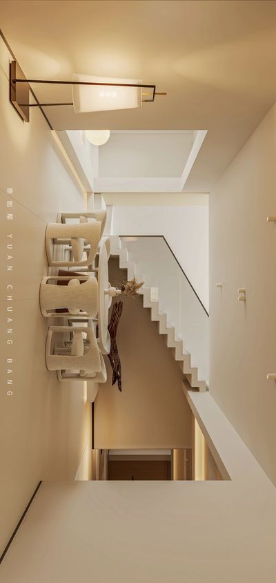 Warm light spills like gold leaf, tracing the fluid lines of white stairs. A round table and sculptural chairs stand as artistic symbols, framing an elegant narrative within the space. A nearby floor lamp, resembling an art piece, plays against the wild charm of natural branches, turning every gathering here into a stroll through an artistic oasis—an encounter with lifes beauty at the intersection of texture and poetry.