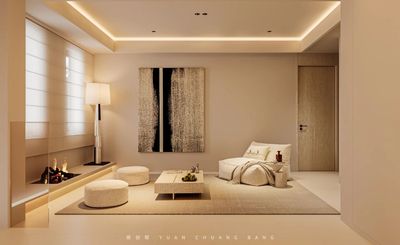 Wood grains and beige fabrics intertwine to create a serene texture. A large art painting, like a mark of time, unfolds its intricate patterns across the wall. Minimalist furniture lines sketch relaxed silhouettes. A small bar tucked in the corner effortlessly transforms daily leisure into poetic immersion.