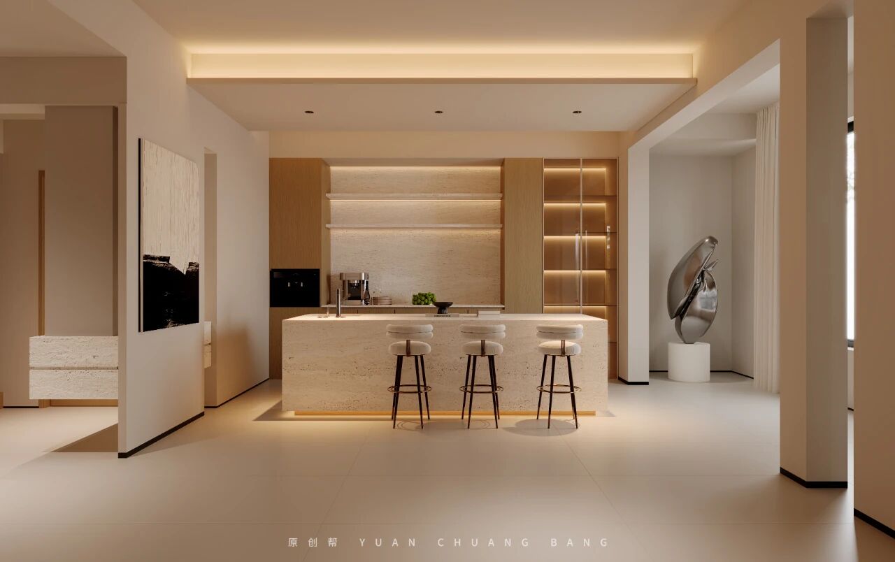 A travertine breakfast bar, like a piece of art shaped by time, radiates a warm, textured grain under soft lighting. Art installations and abstract paintings converse, amplifying the spaces artistic sensibility. Coffee utensils and fresh greenery provide accents, balancing simplicity and luxury in every casual meal or drink here.