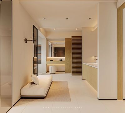 Dual vanities resemble sculptural art; stone textures and integrated lighting weave a light-luxury feel. The lines of the transitional corridor flow poetically; the blend of wood and warm tones balances utility and beauty with every passage, carving out a private sanctuary that heals both body and mind.