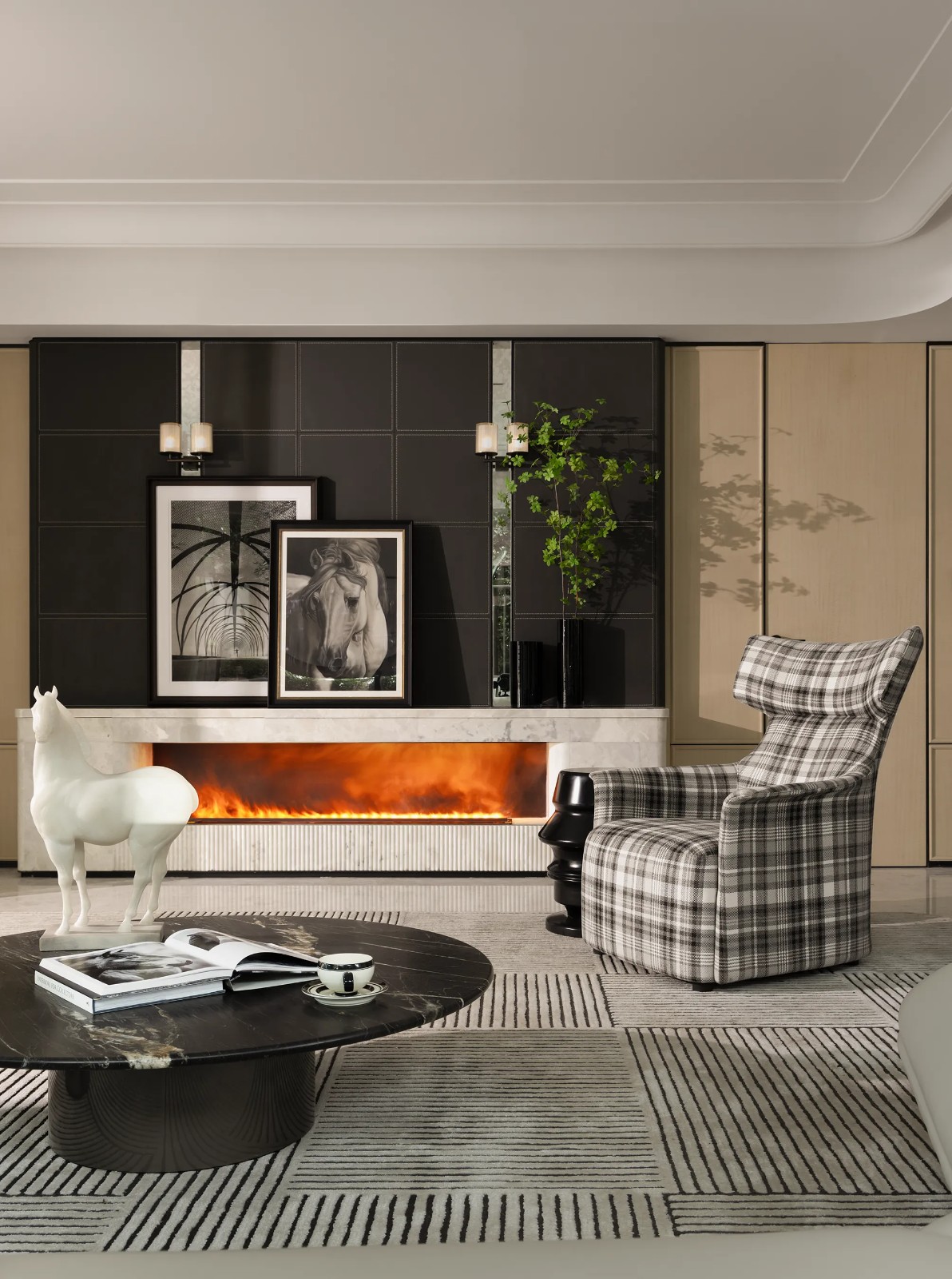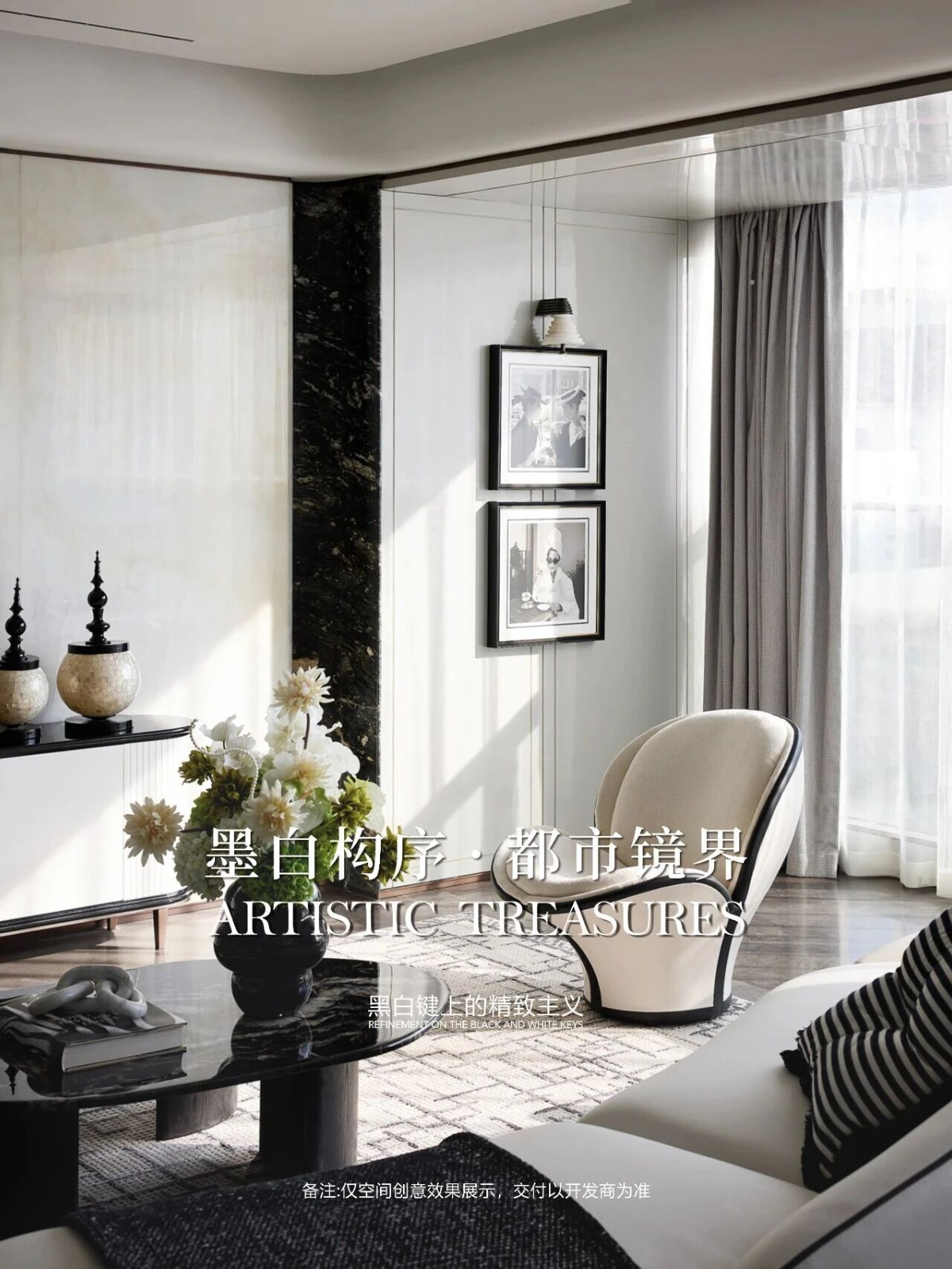 在纯净的白与柔和的米灰构筑的空间基底中,点缀以深邃的映黧黑提升视觉层次,细腻而富有肌理的面料与现代质感的材质结合,绿植悄然融入冷峻的色调之间,呈现一个兼具现代精致与都市时尚感的居所。