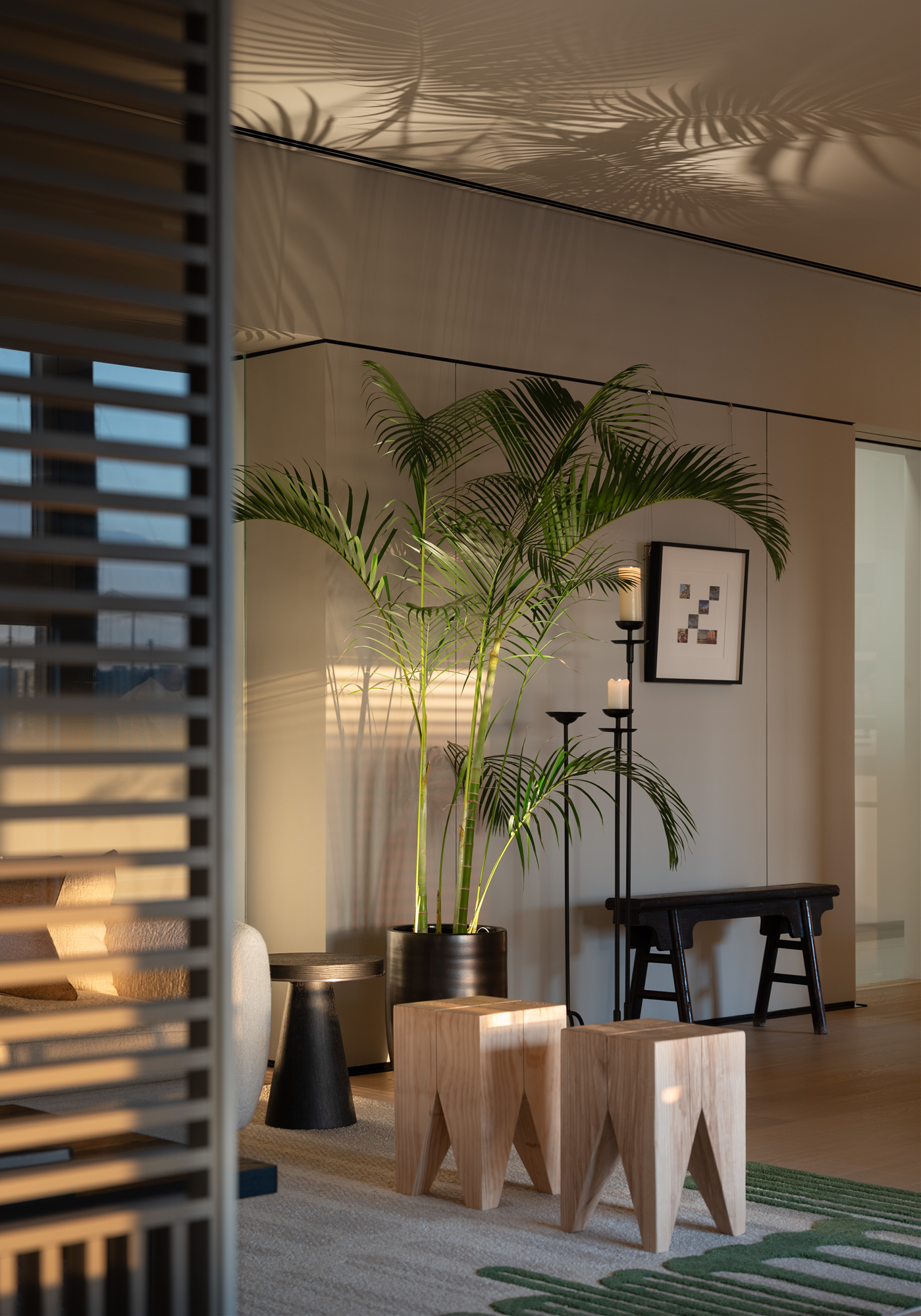 在住宅的起居室和餐厅区域之间,是一面面向楼梯的木饰面墙。在这里,Liaigre的Tangris浅色木柜和法国艺术家Pierre Bonnefille的青铜作品在深色背景下格外引人注目。这些作品面向楼梯,楼梯墙面采用石灰石膏效果处理;其抛光外观让人联想到日本侘寂美学,即欣赏不完美中的美。