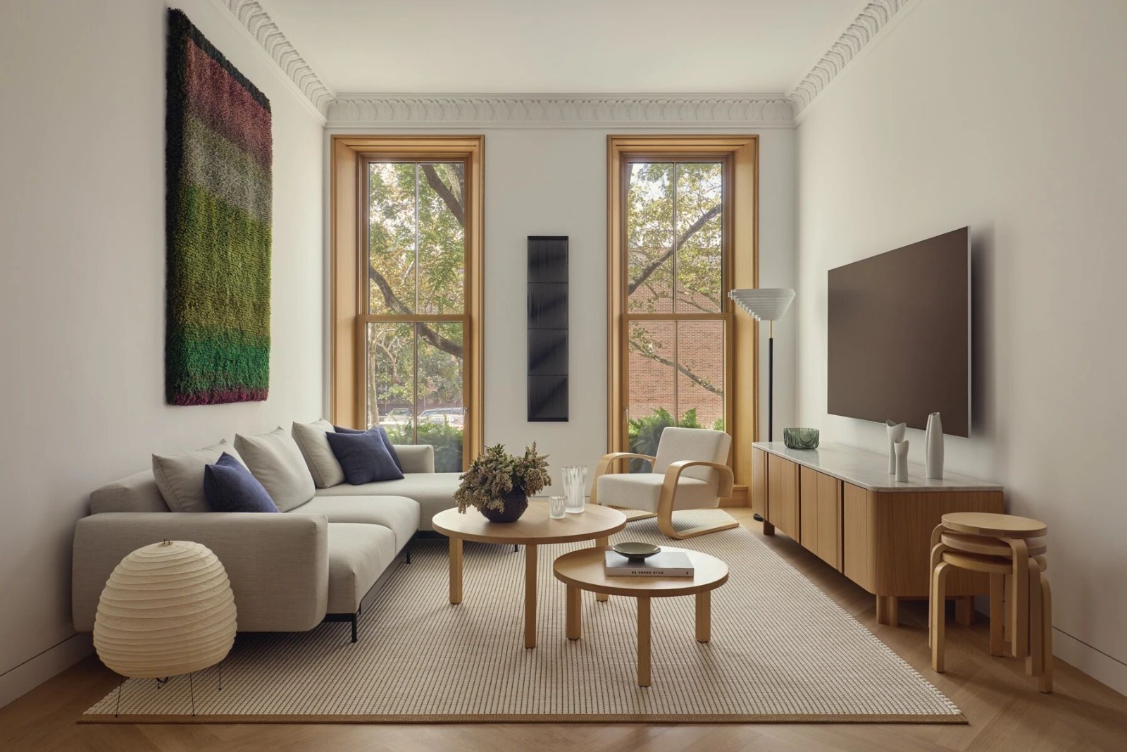 客厅从传统室内的横梁结构里抽取“骨骼逻辑”,以简化的线性秩序完成当代演绎,叙事由“放”转“收”:放开尺度,收敛语汇。