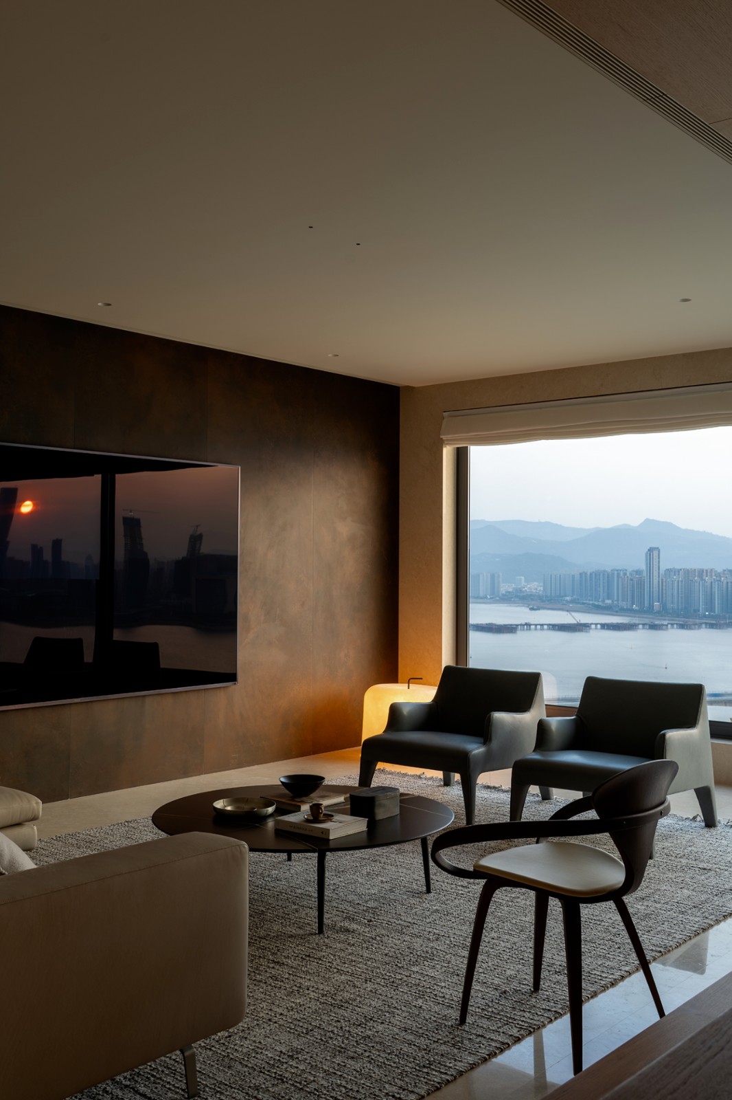 空间组织上,设计强调“流动性”与“连续性”。大尺度开窗与通透界面模糊室内外边界,使自然光成为主导性的结构元素;统一的地面材料延展至室外,强化视觉上的整体性。家具与陈设融合定制设计与精选中古物件,通过金属、竹材、皮革等多重材质构建层次丰富的触觉体验,在理性几何与柔性体量之间取得平衡。