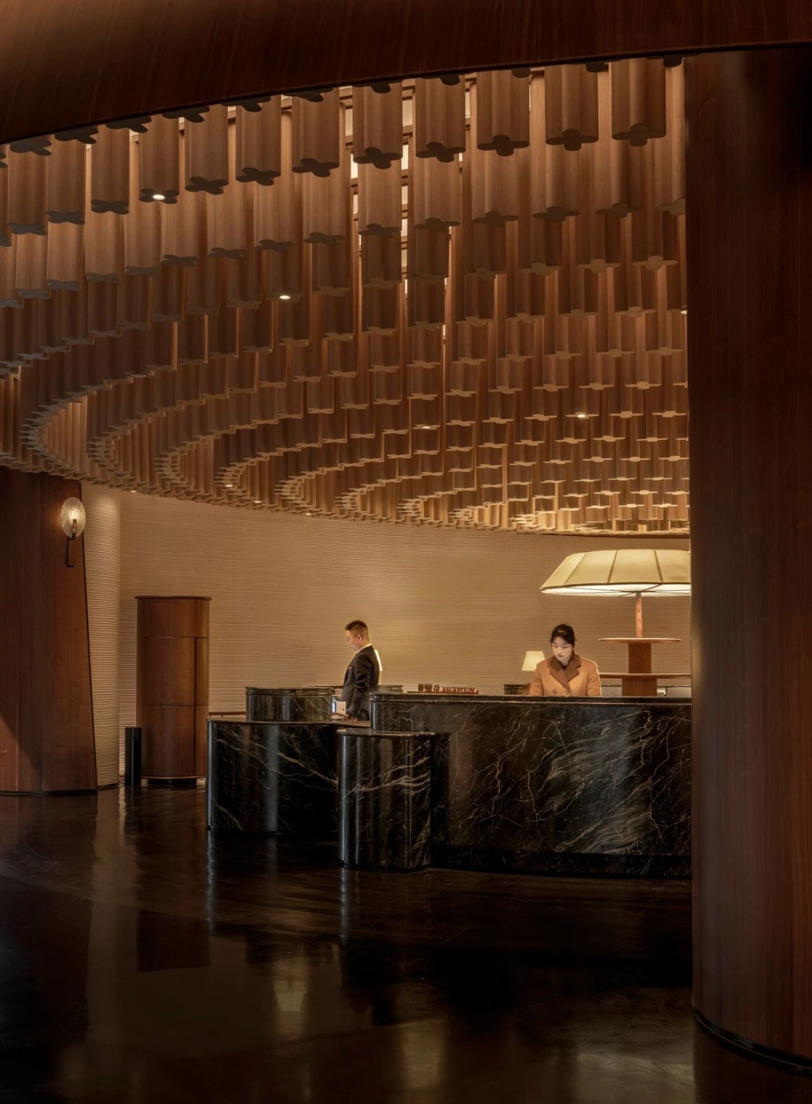 藝術家陽新的雕塑《袈裟》靜置其前,背景之“動”與雕塑之“靜”,石材之“剛”與視覺之“柔”,在此達成了一種充滿禪意的哲學平衡。